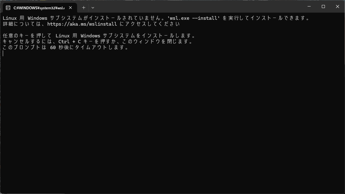 この時点でWSLがインストールされていない場合はUACプロンプトが表示され、「はい」ボタンをクリックすると続けて以下のウィンドウが表示されるので、任意のキーを押してWSLをインストールします。