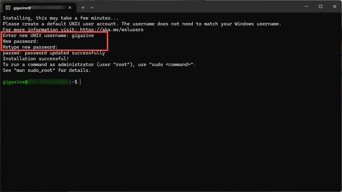 WSLのインストールが完了すると一旦Windowsを再起動します。その後Ubuntuを起動すると、初回起動時はユーザー名とパスワードの設定が求められるので、任意のユーザー名とパスワードを入力して設定します。入力後、プロンプトが表示されるようになればWSL上のUbuntuが使える状態になっています。