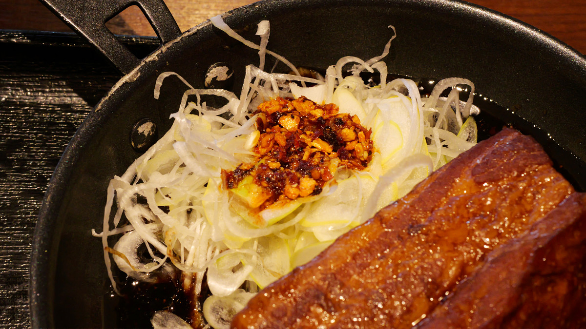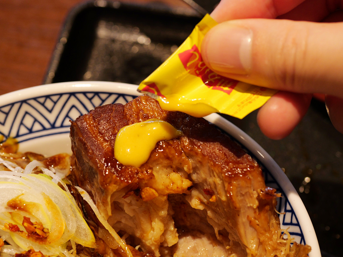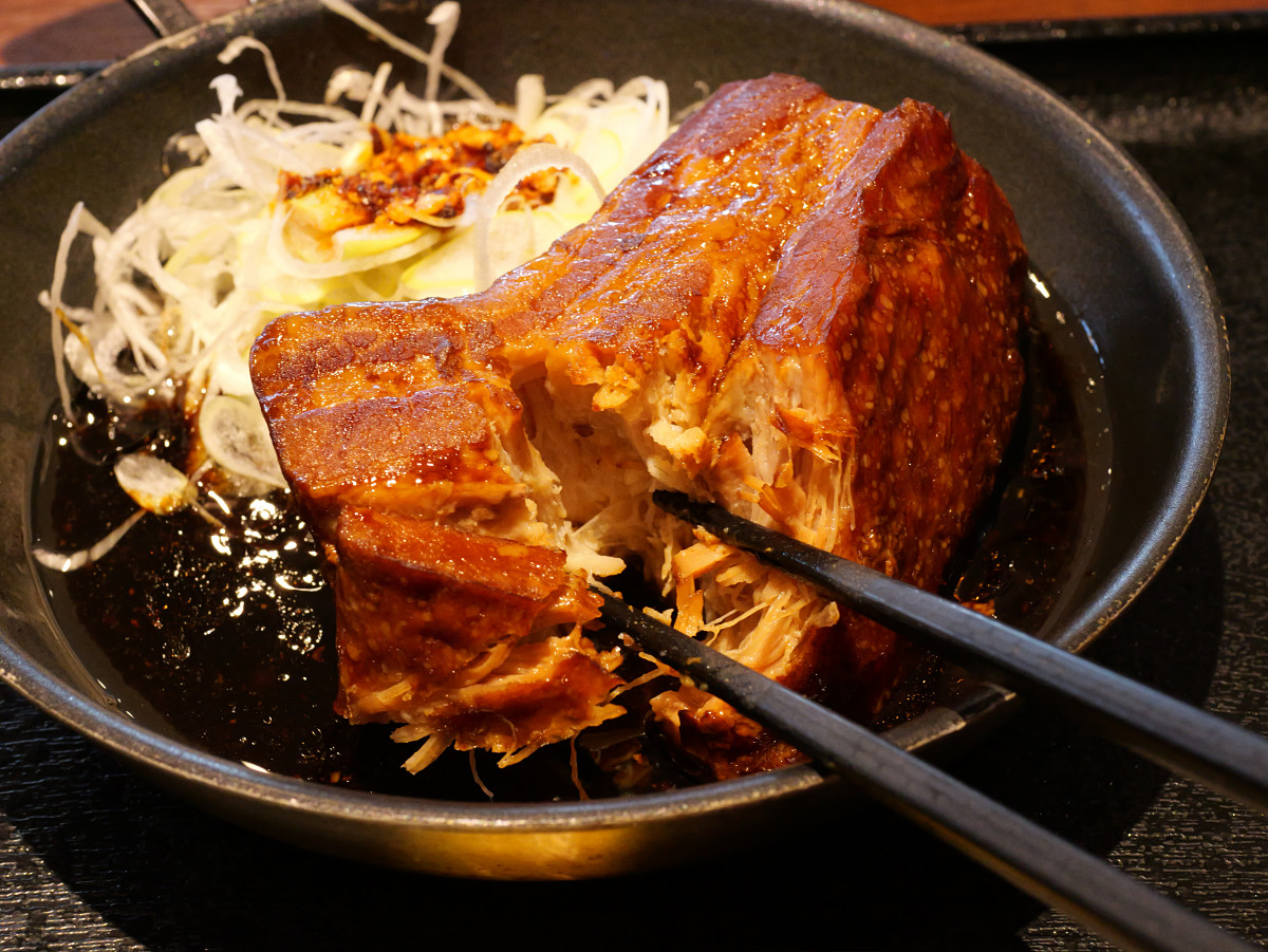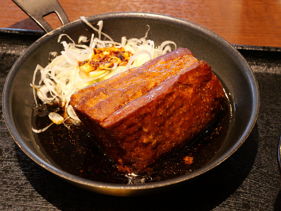 脂が多めでしつこい味ですが、シャキシャキしたネギやニンニク強めな食べるラー油も付いてくるので飽きることはありません。また、からしをつければサッパリと楽しむことも可能。豚角煮はかなり味が濃いので、大盛りのご飯が一瞬でなくなりました。