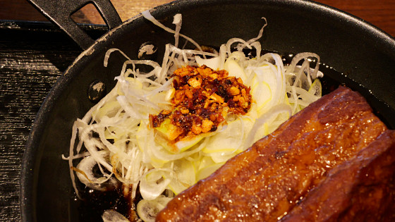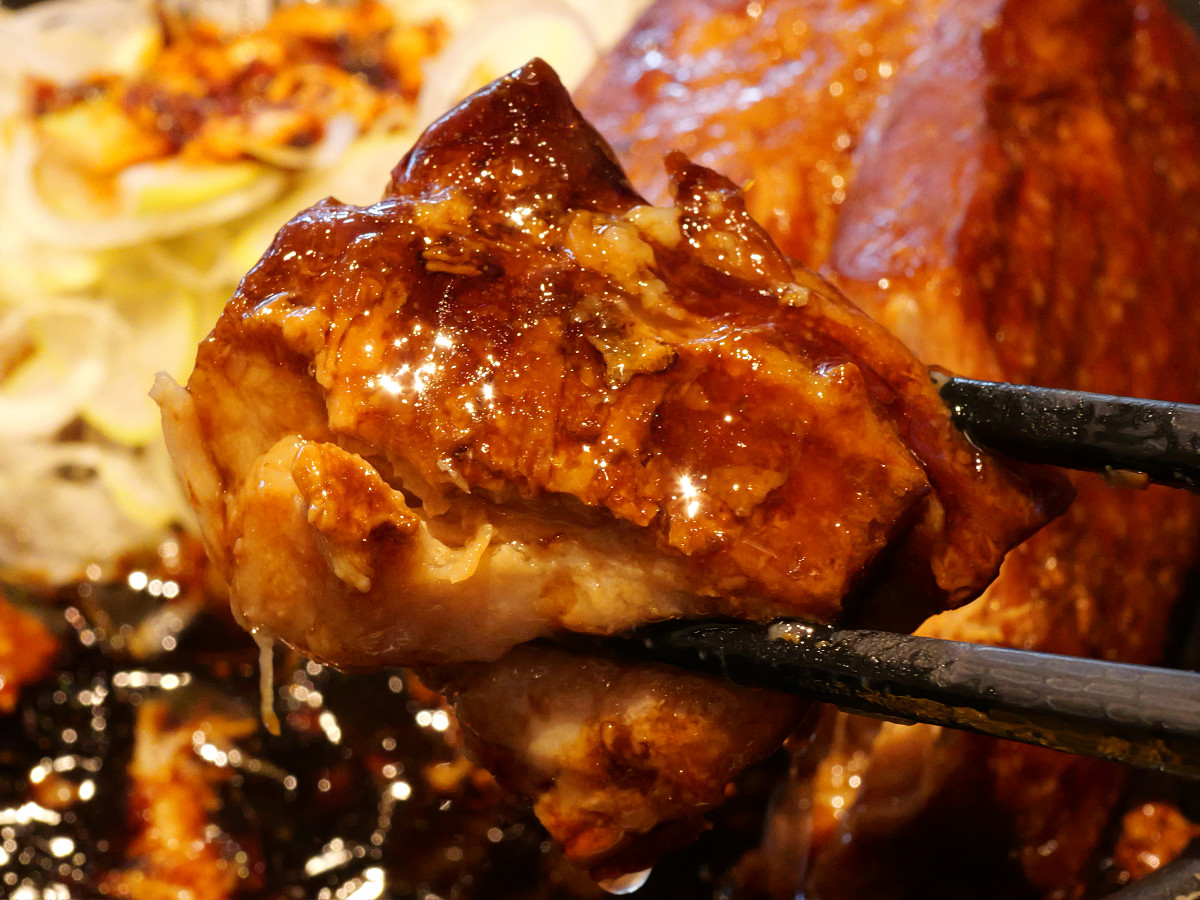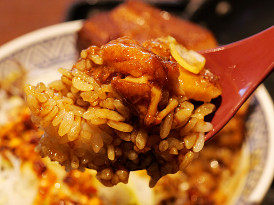口に入れるとホロホロ崩れます。タレは甘辛な醤油味で、豚の脂の甘さと相まってかなり甘い味付けです。