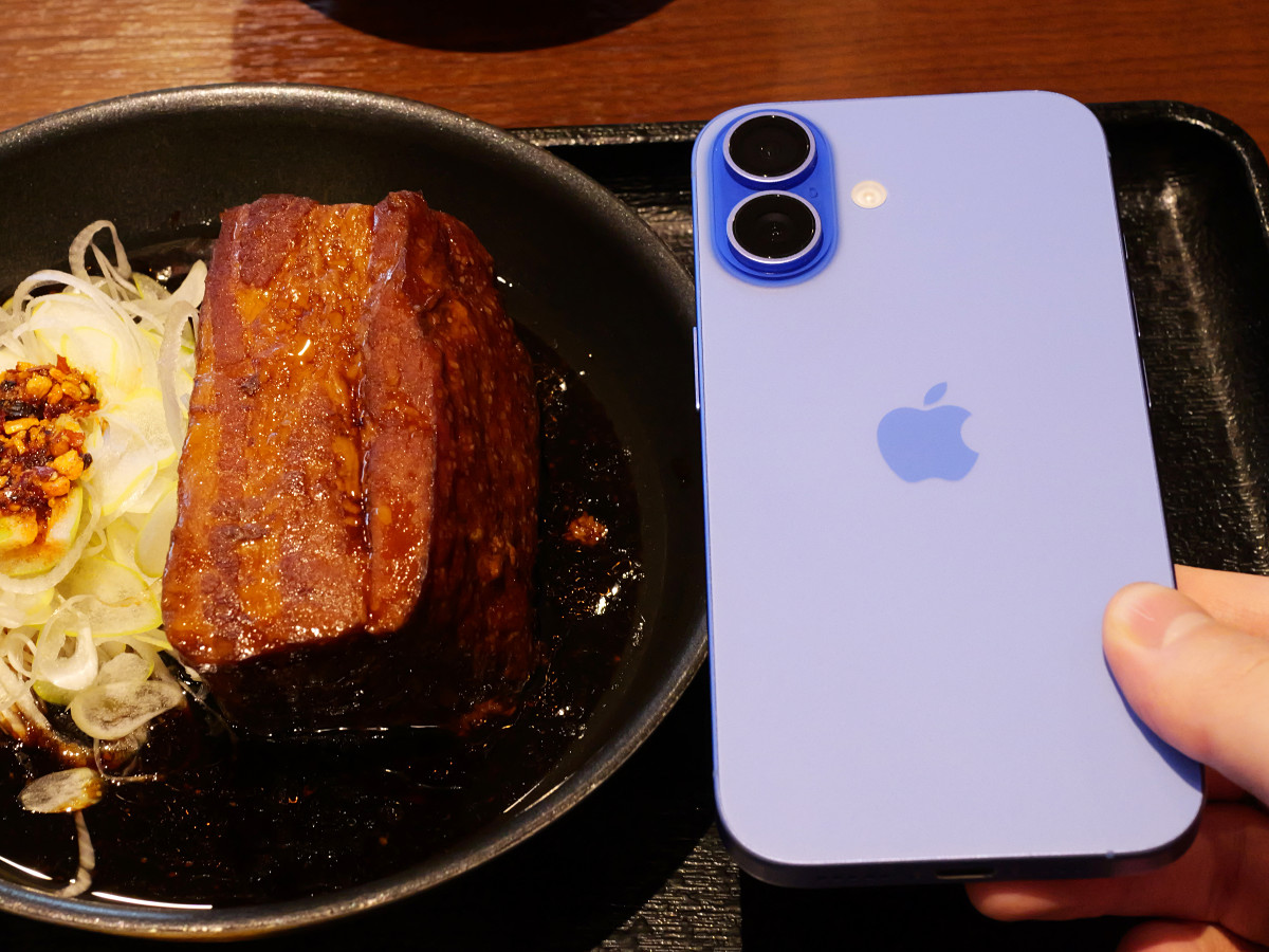 豚角煮の大きさが分かりやすいようにiPhone 16と並べるとこんな感じ。