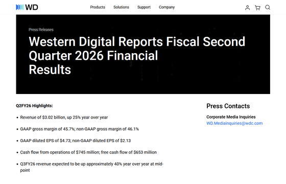 そんな中、Western Digitalは2026年1月29日に2026年度第2四半期(2025年10月~12月)の決算を発表。売上高は前年同期比で25%増の30億1700万ドル(約4600億円)、粗利益率は45.7%、営業利益率は30.1%を記録したと発表しました。同期における売上高の増加は、AIによる大容量HDD需要の増加が大きく貢献しています。
