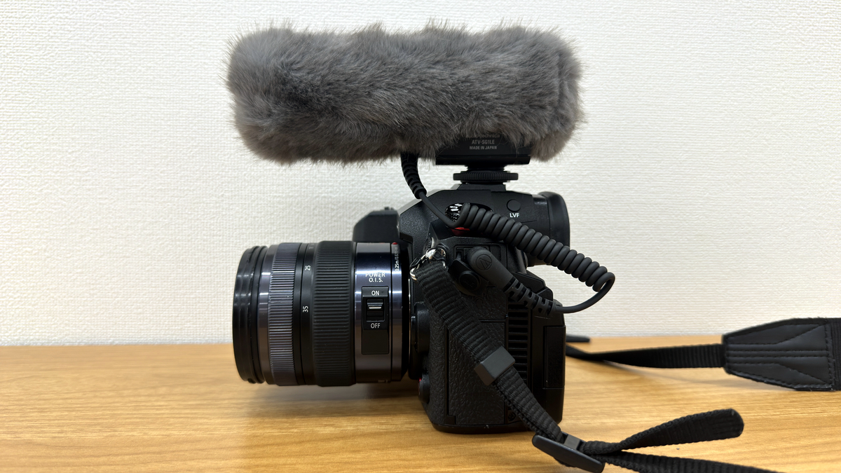 ATV-SG1LEにウインドマフを被せた上で、Panasonic GH6のホットシューに取り付けてみたところが以下。ウインドマフはかなりタイトなので、取り付ける時は注意が必要です。