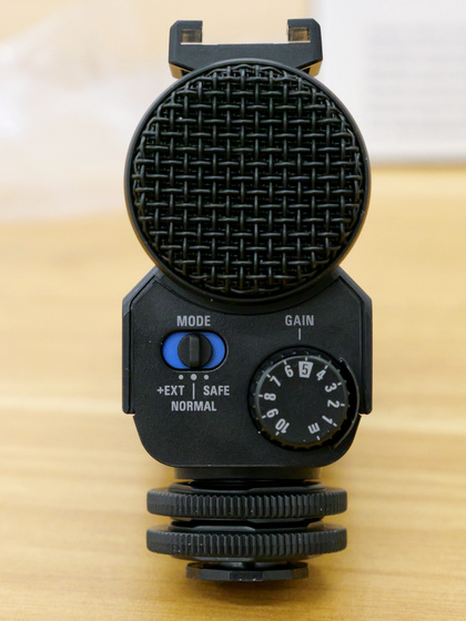 背面には出力モードの切り替えスイッチと出力ゲイン調整ノブがあります。出力モードのうち、「+EXT」は外部マイク入力を追加するモードで、この場合は外部マイクの音声がRチャンネルにモノラル出力可能。マイクを向けている人の音をステレオで撮影しつつ、同時に撮影者の声をモノラルで収録することができるというわけです。「NORMAL」は通常使用のモードで、「SAFE」は大声や突発的な音割れに備えるためのセーフティトラック機能を使用するモード。