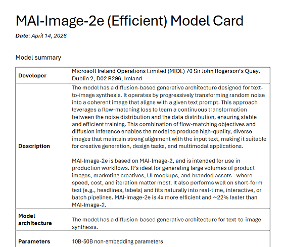 また、MAI-Image-2-Efficientの仕様を記したモデルカードが以下のリンク先で公開されています。