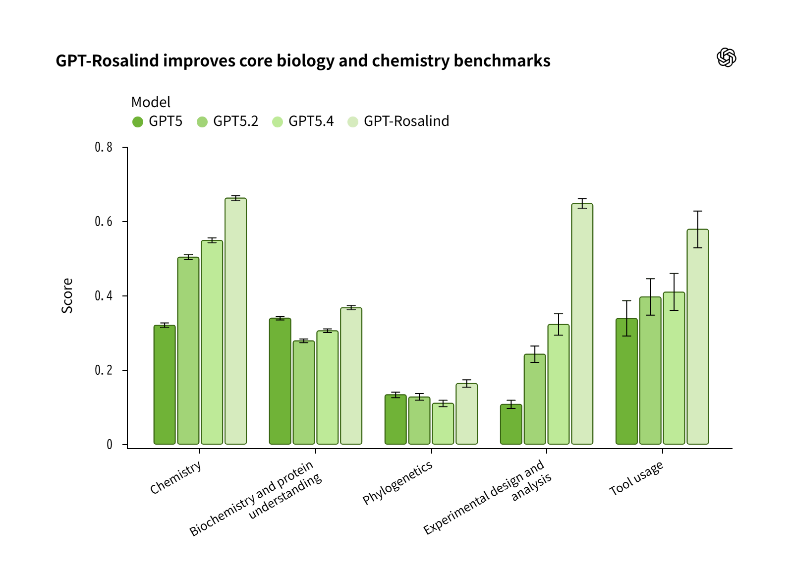 性能面では、さまざまな分野の生物学をまたぐ推論や文献調査、配列から機能の解釈、実験計画、データ解析といった科学ワークフローで高い有効性を示したとのこと。OpenAIは、GPT-Rosalindが化学やタンパク質理解、ゲノミクス、実験設計と解析などの分野でGPT-5、GPT-5.2、GPT-5.4より高いスコアを示しており、特に実験設計と解析、化学分野で改善幅が大きいことが示されたとアピールしています。