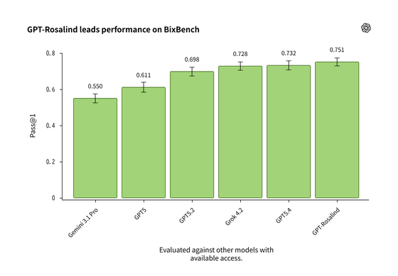 現実のバイオインフォマティクスやデータ解析を想定したBixBenchでは、GPT-Rosalindは公開スコアがあるモデルの中で最高水準のPass@1である0.751を記録したとのこと。