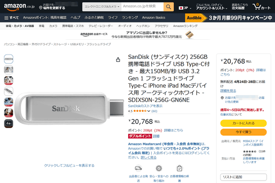 「SanDisk Phone Drive USB-C対応」はAmazon.co.jpでも販売されており、容量が256GBのモデルは税込2万768円です。