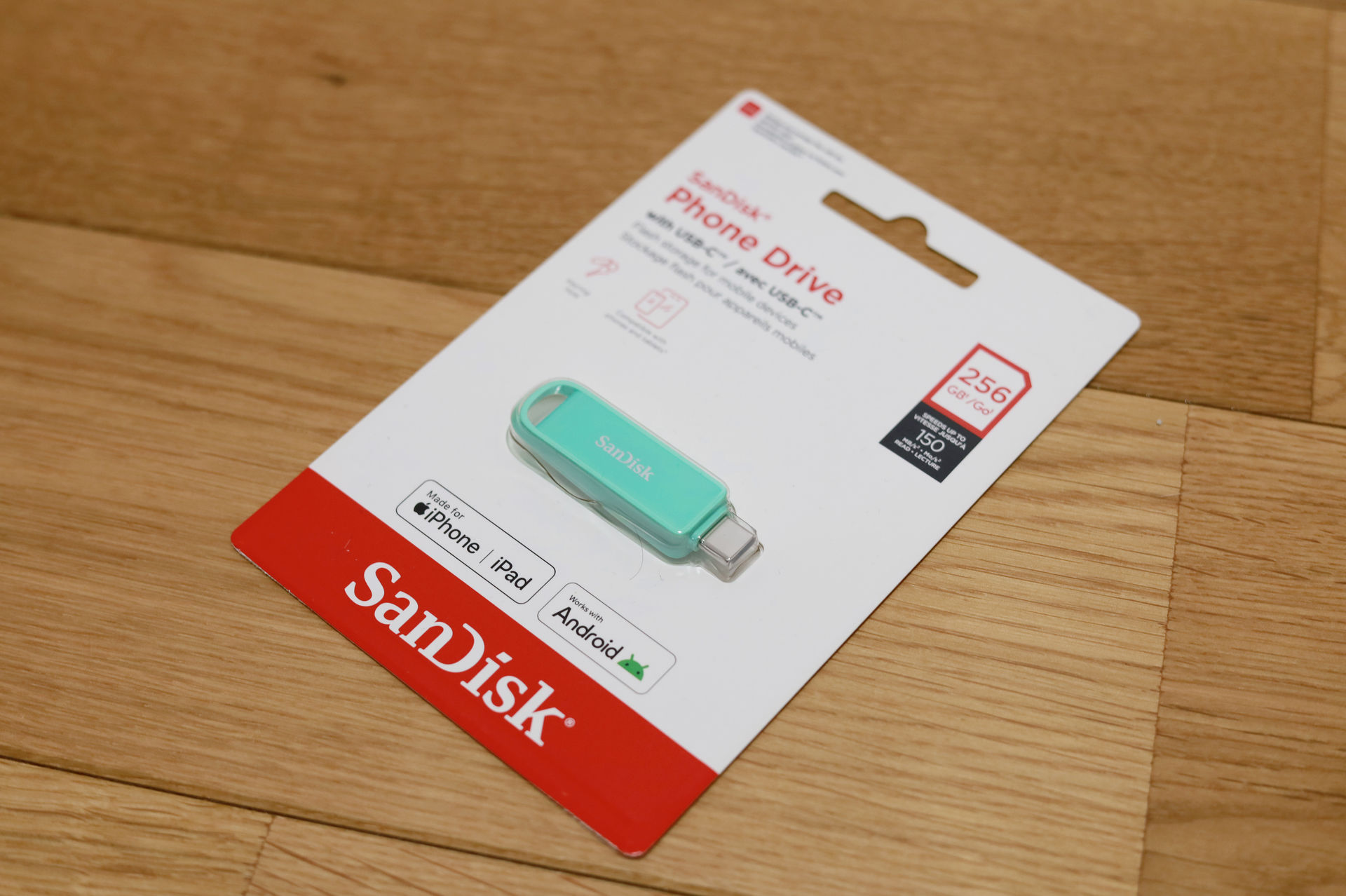 「SanDisk Phone Drive USB-C対応」のパッケージはこんな感じ。本体カラ―はArctic White・Maritime Blue・Seastar Pink・Seafoam Greenの4色あり、容量は64GB・128GB・256GB・512GB・1TBの5種類用意されています。今回はSeafoam Greenの256GBを使います。