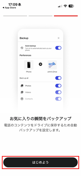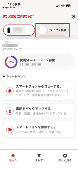 これで初回起動時のチュートリアルおよび設定は終了。「SanDisk Phone Drive USB-C対応」を利用するには、「ドライブを接続」をタップ。