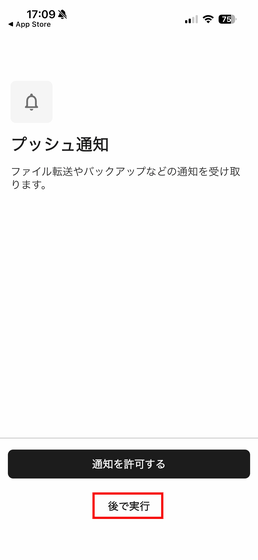 初回起動時は通知に関する許可を求められます。「後で実行」をタップ。
