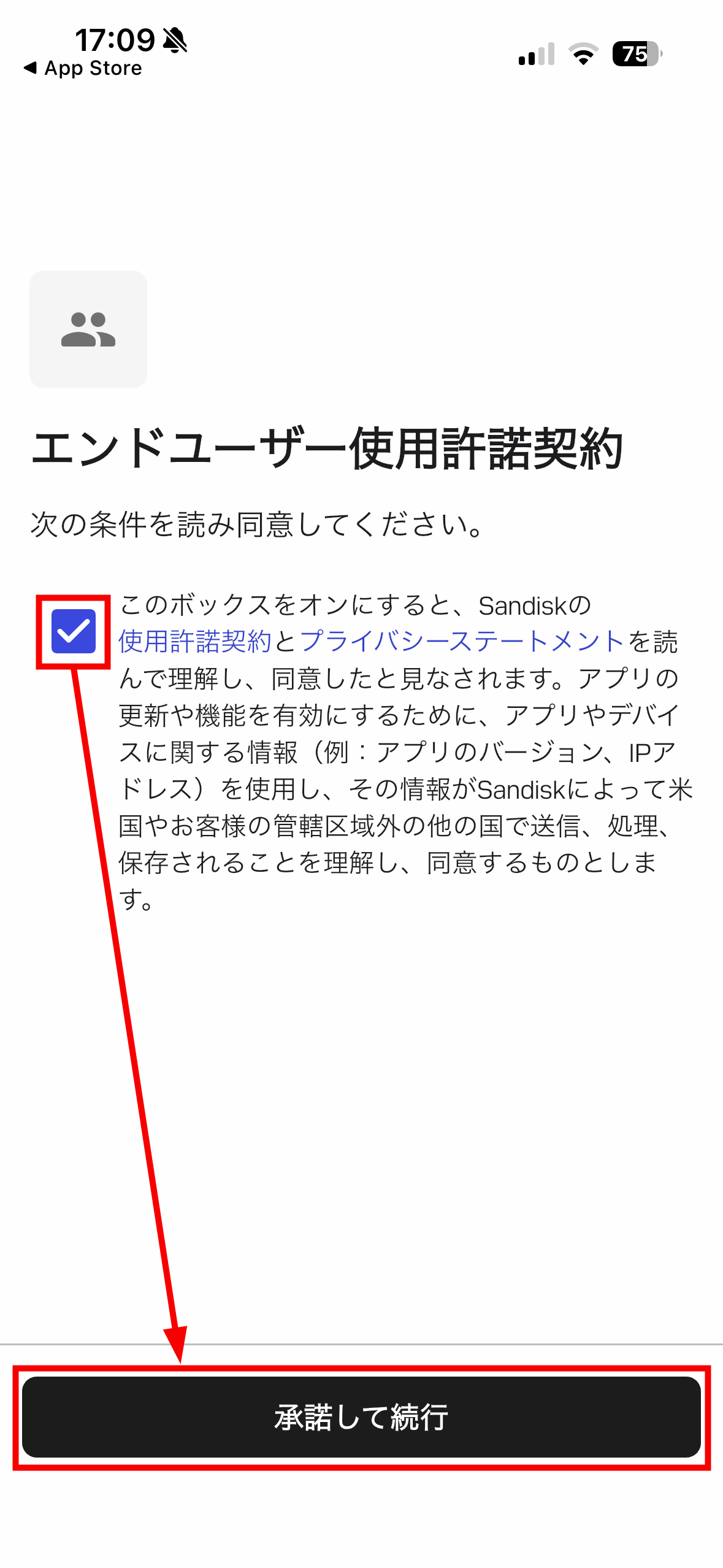 エンドユーザー使用許諾契約への同意が求められるので、使用許諾契約とプライバシーステートメントを読んだらチェックボタンをタップして、「承認して続行」をタップ。