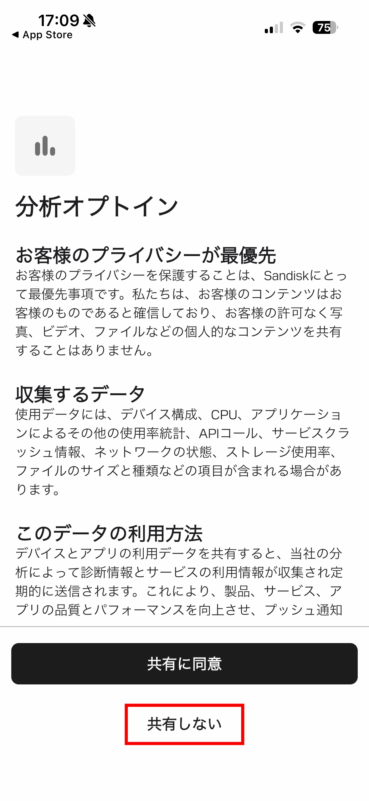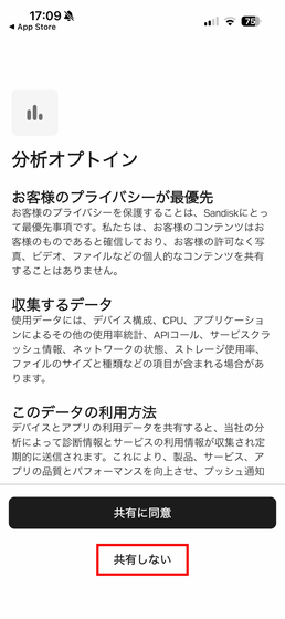 データの共有に関する同意が求められます。「共有しない」をタップ。
