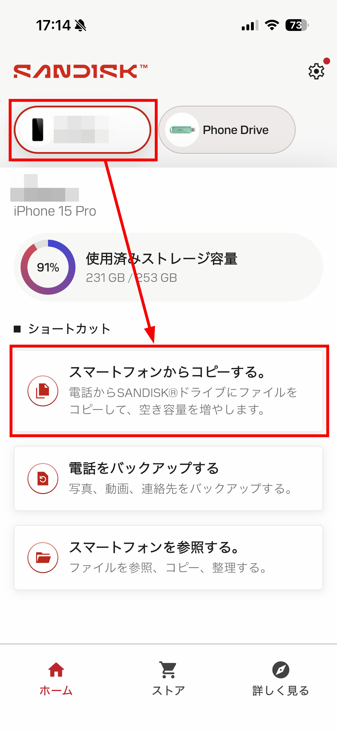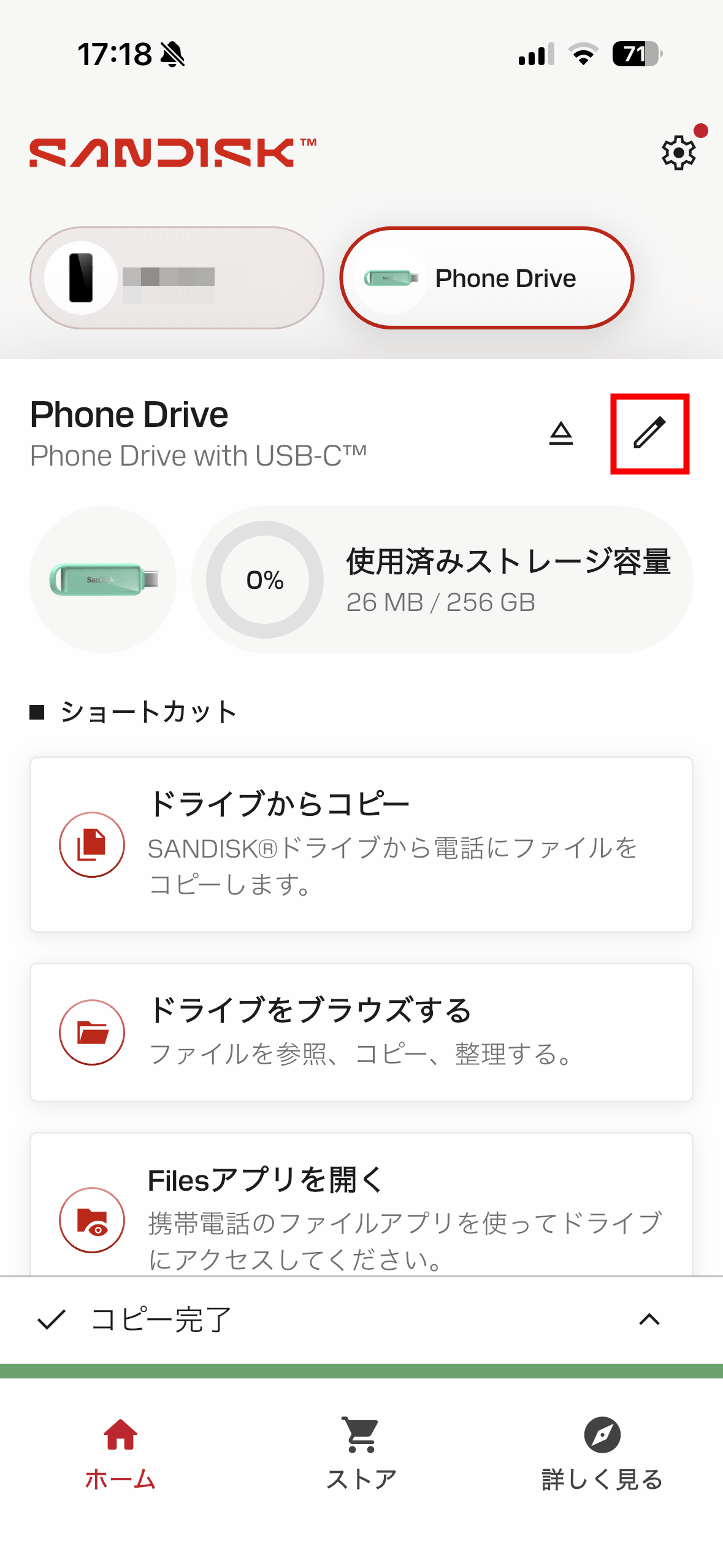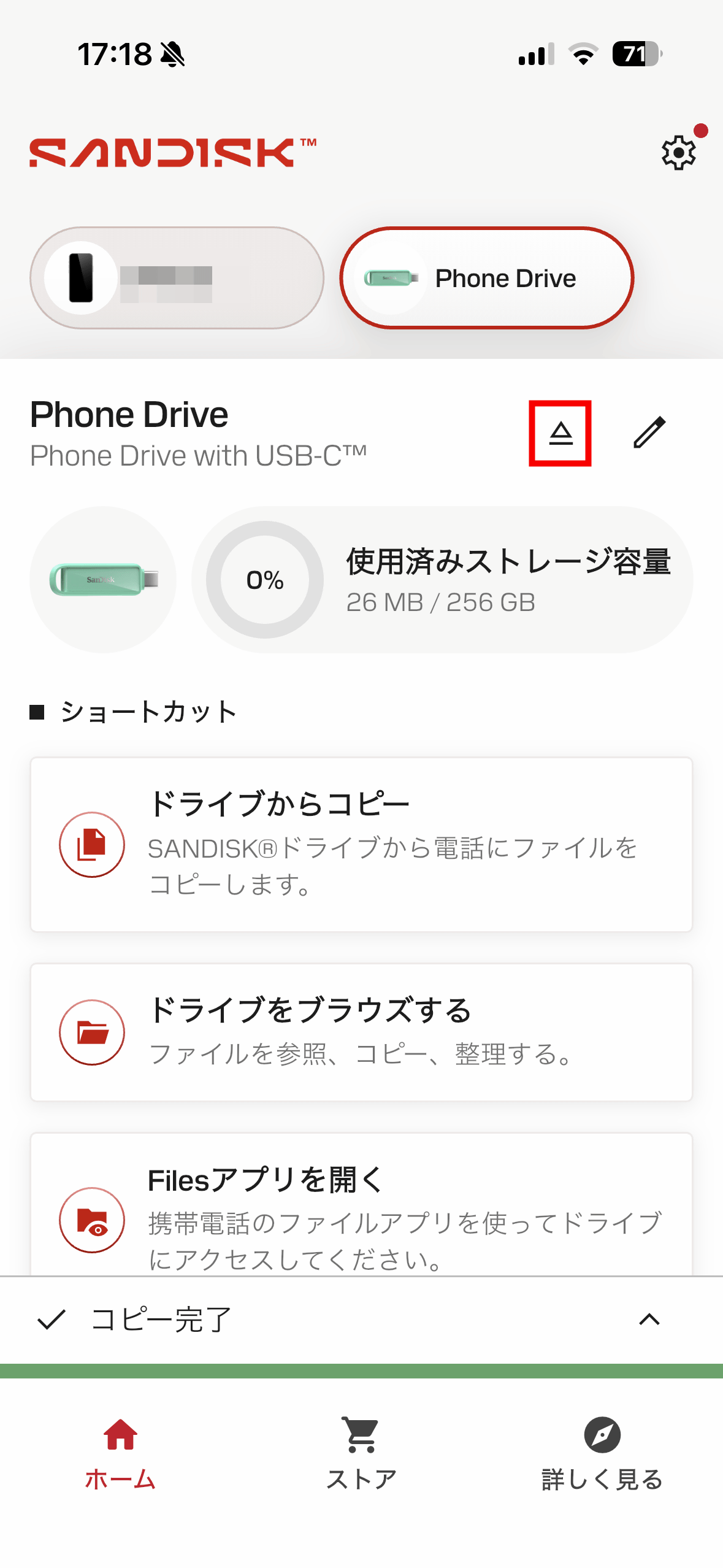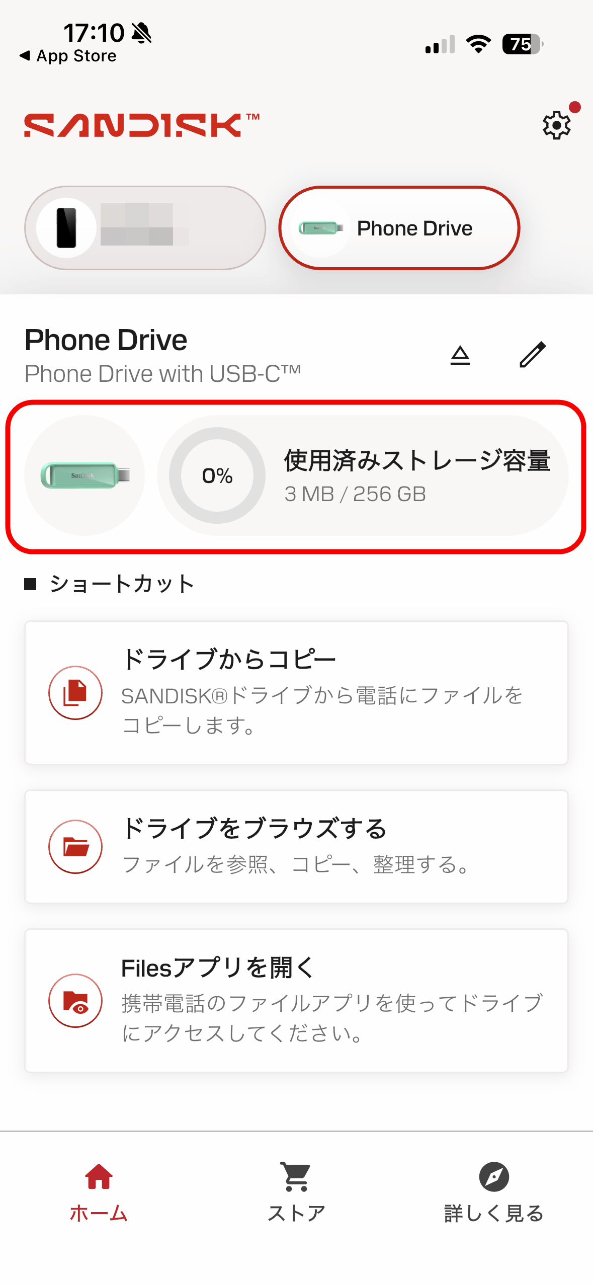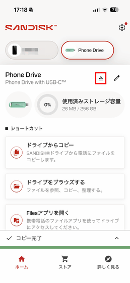 「SanDisk Phone Drive USB-C対応」の名称脇にある三角形のアイコンをタップ。