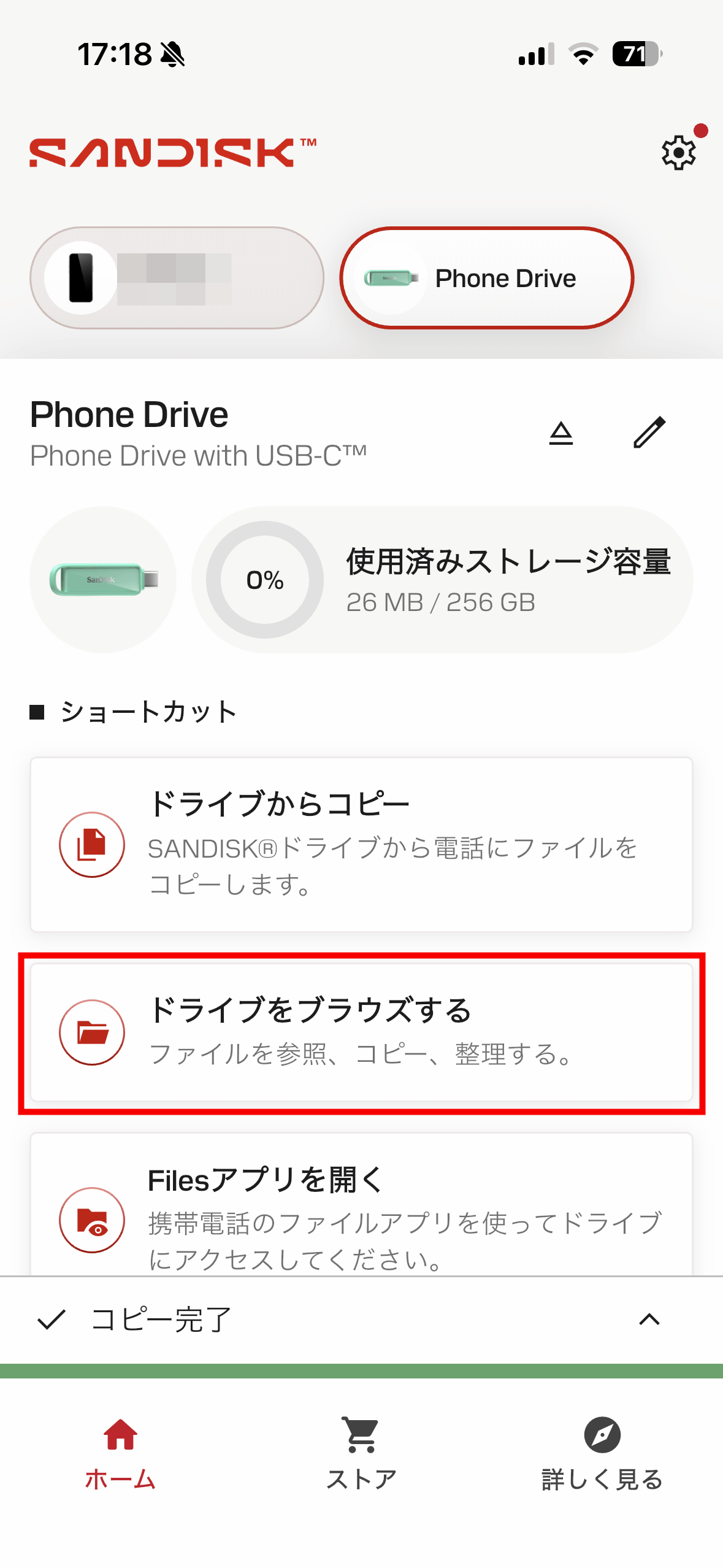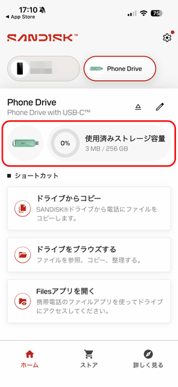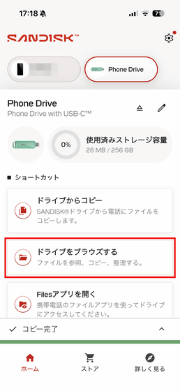 「SanDisk Phone Drive USB-C対応」にコピーしたデータは「ドライブをブラウズする」をタップするとチェック可能。