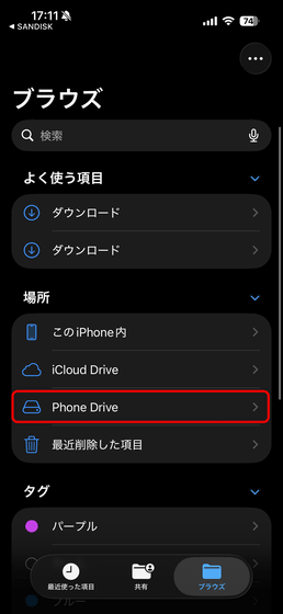 なお、iPhoneに「SanDisk Phone Drive USB-C対応」をつないだ状態でApple純正アプリの「ファイル」を開くと、「場所」に「Phone Drive」という項目が追加で表示されるようになり、ここから「SanDisk Phone Drive USB-C対応」に保存されているファイルを管理することもできます。
