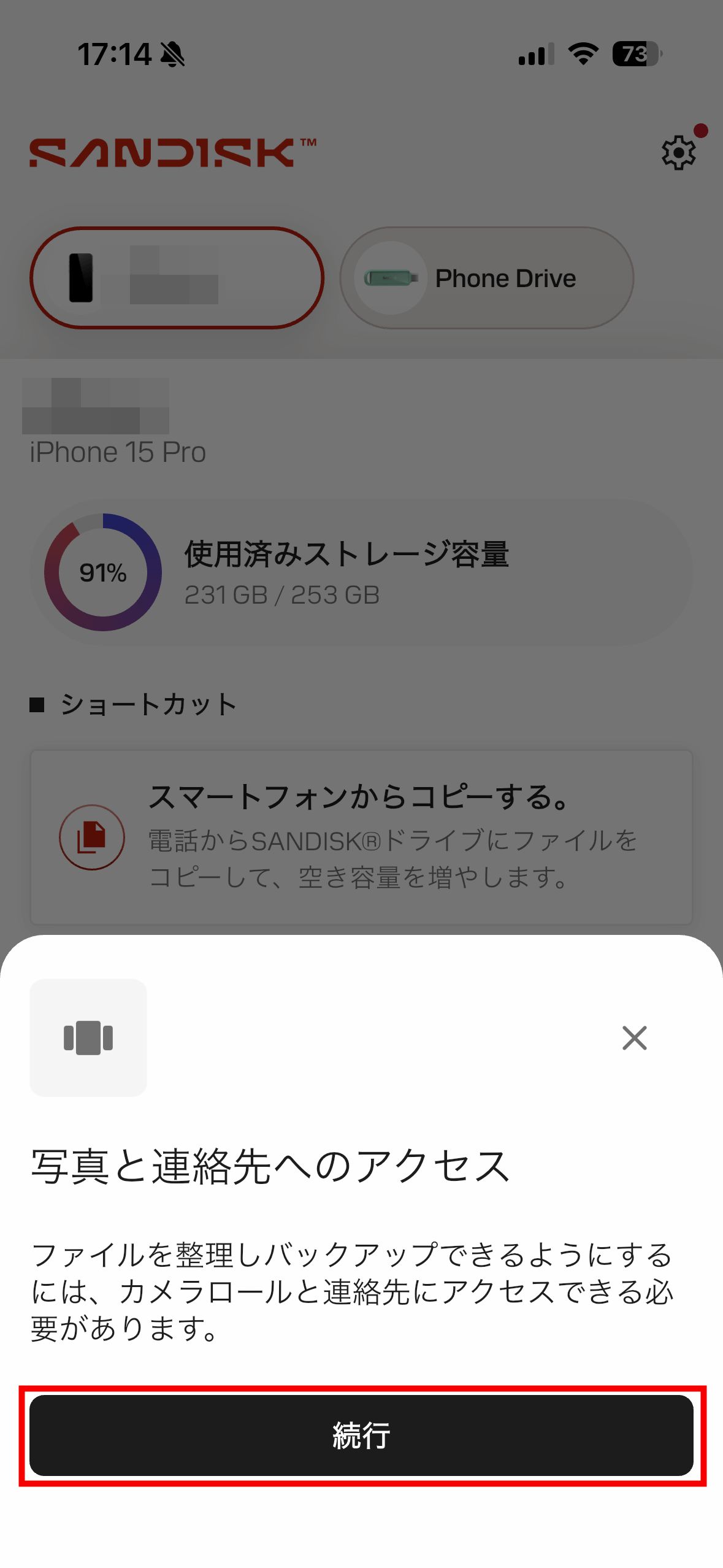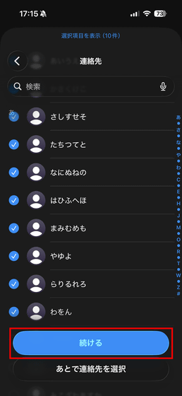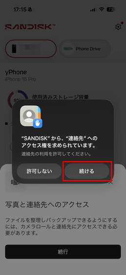 「SanDisk Phone Drive USB-C対応」にコピーしたい連絡先を選択したら「続ける」をタップ。