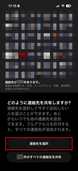 連絡先の共有を求められるので、「連絡先を選択」をタップ。