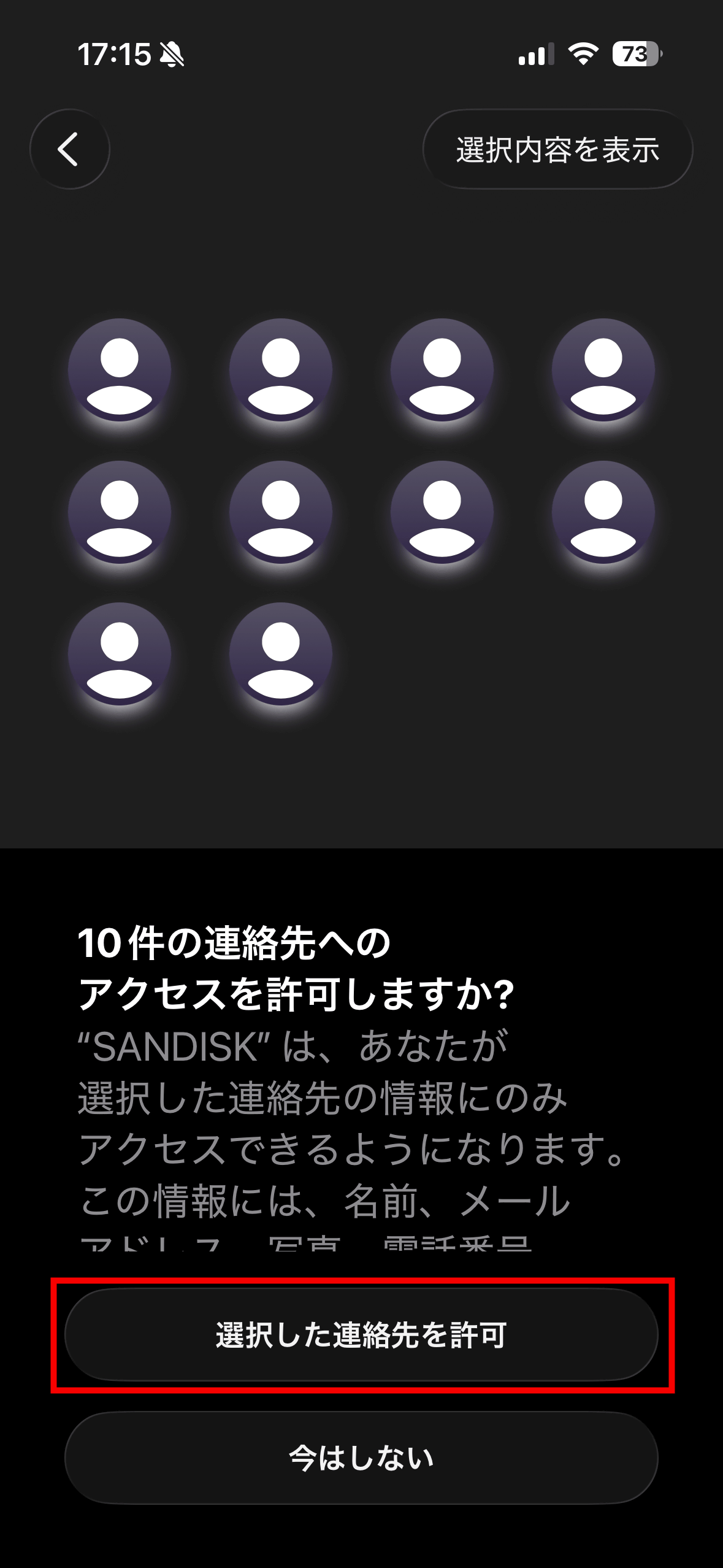 「選択した連絡先を許可」をタップ。なお、連絡先をバックアップする場合でも、ここで「選択した連絡先」しかコピーされません。