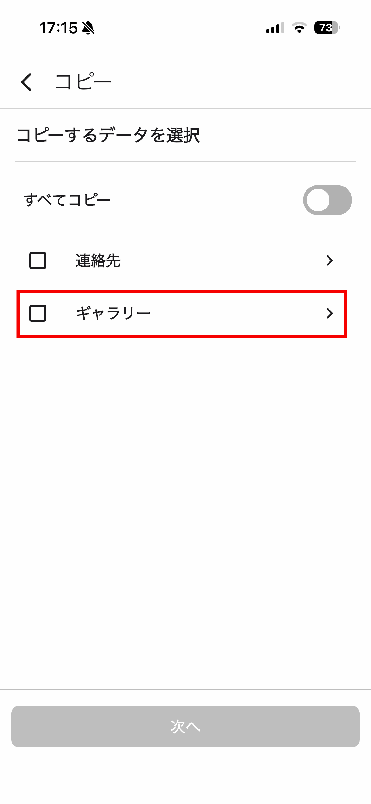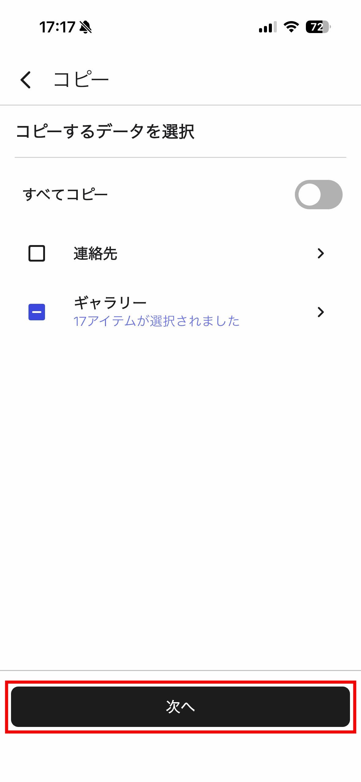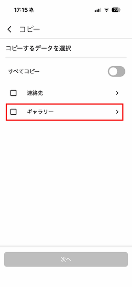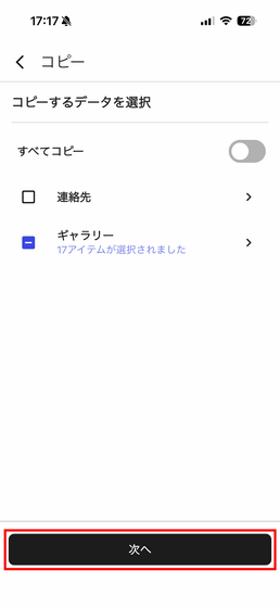 コピーしたい写真・動画を選択したら「次へ」をタップ。