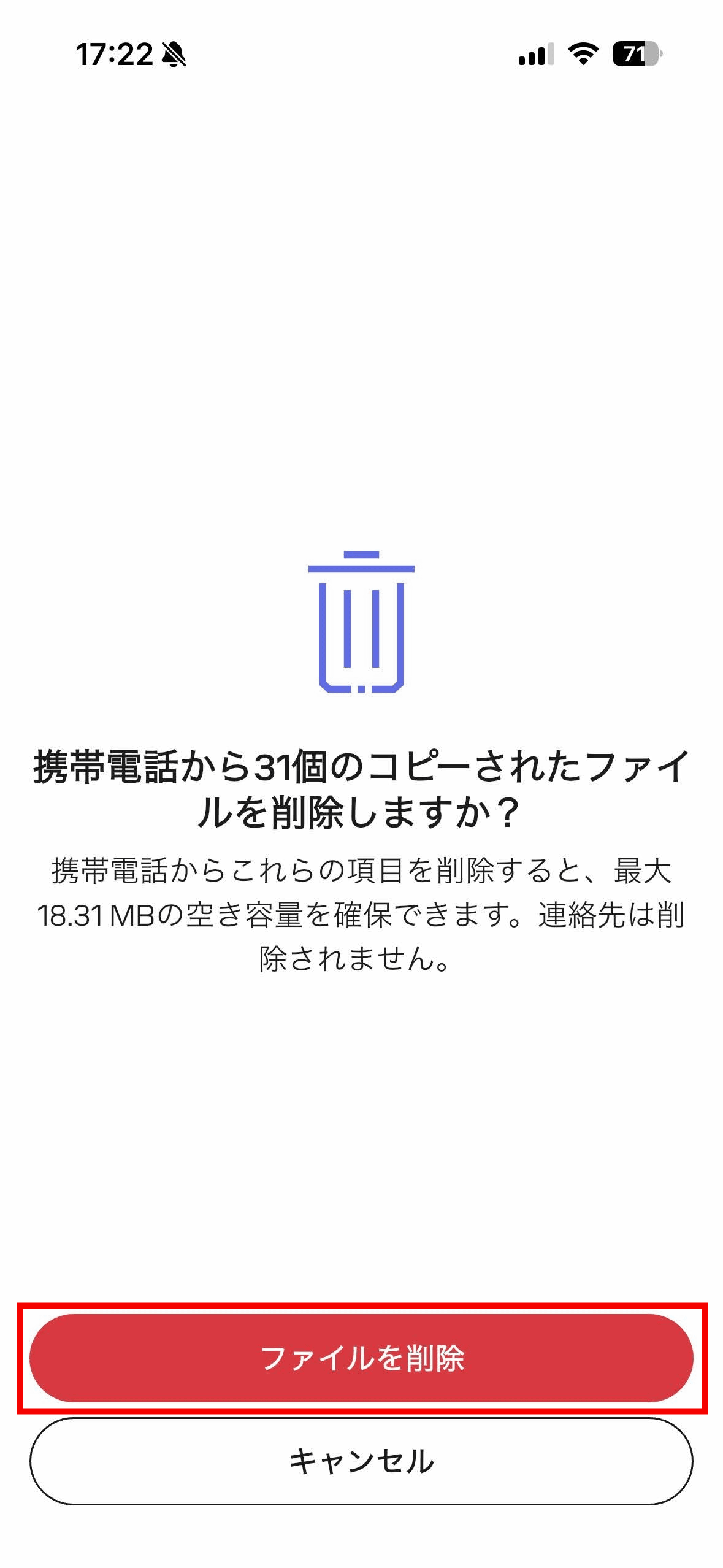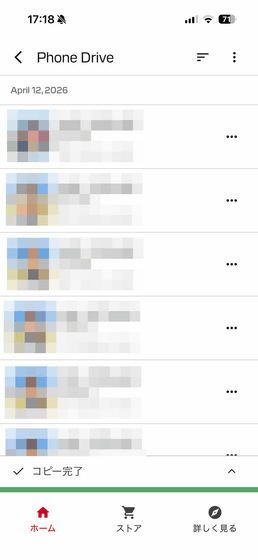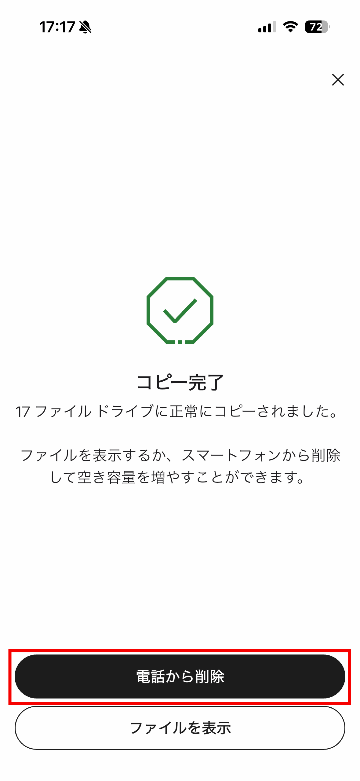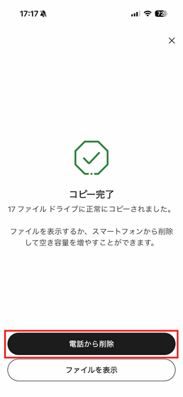 コピーが完了したら「電話から削除」と「ファイルを表示」を選択可能。コピーしたファイルを削除したくない場合は、画面右上の×ボタンを押せばOK。今回は「電話から削除」をタップしてみます。
