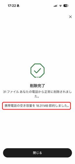 するとファイルの削除によりiPhoneのストレージがどれだけ空いたか表示されます。