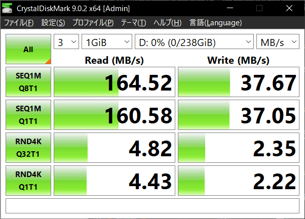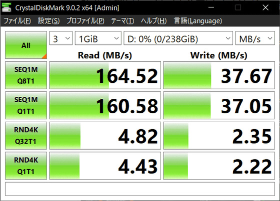 そこで、ベンチマークソフトの「CrystalDiskMark」を使ってデータ転送速度を測定してみたところ、シーケンシャル読み込み速度が約160MB/s、シーケンシャル書き込み速度は約38MB/s、ランダム読み込み速度は約4.8MB/s、ランダム書き込み速度は約2.4MB/sでした。