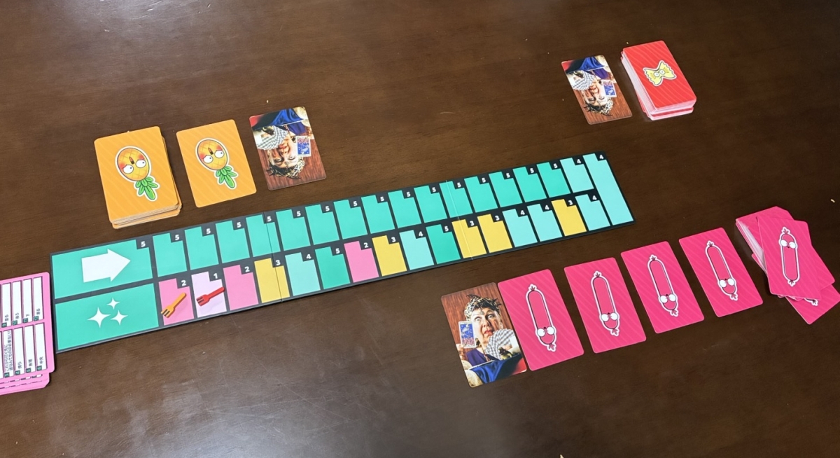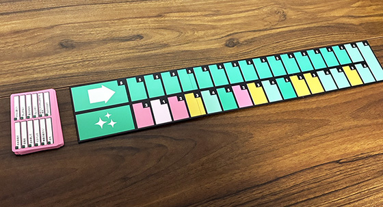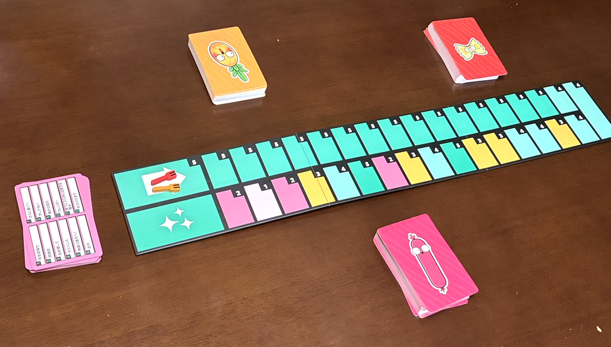 そして、プレイヤーカラーと同じ色のフォークトークンをゲームボード上のスタート位置に配置します。詳しくは後述しますが、奇数人数でプレイする場合はプレイヤーの一人を「参照プレイヤー」とするため、フォークトークンは参照プレイヤー以外の分を置けばOK。今回はピンクを参照プレイヤーとしたので、赤とオレンジのフォークトークンをスタート位置に置いています。