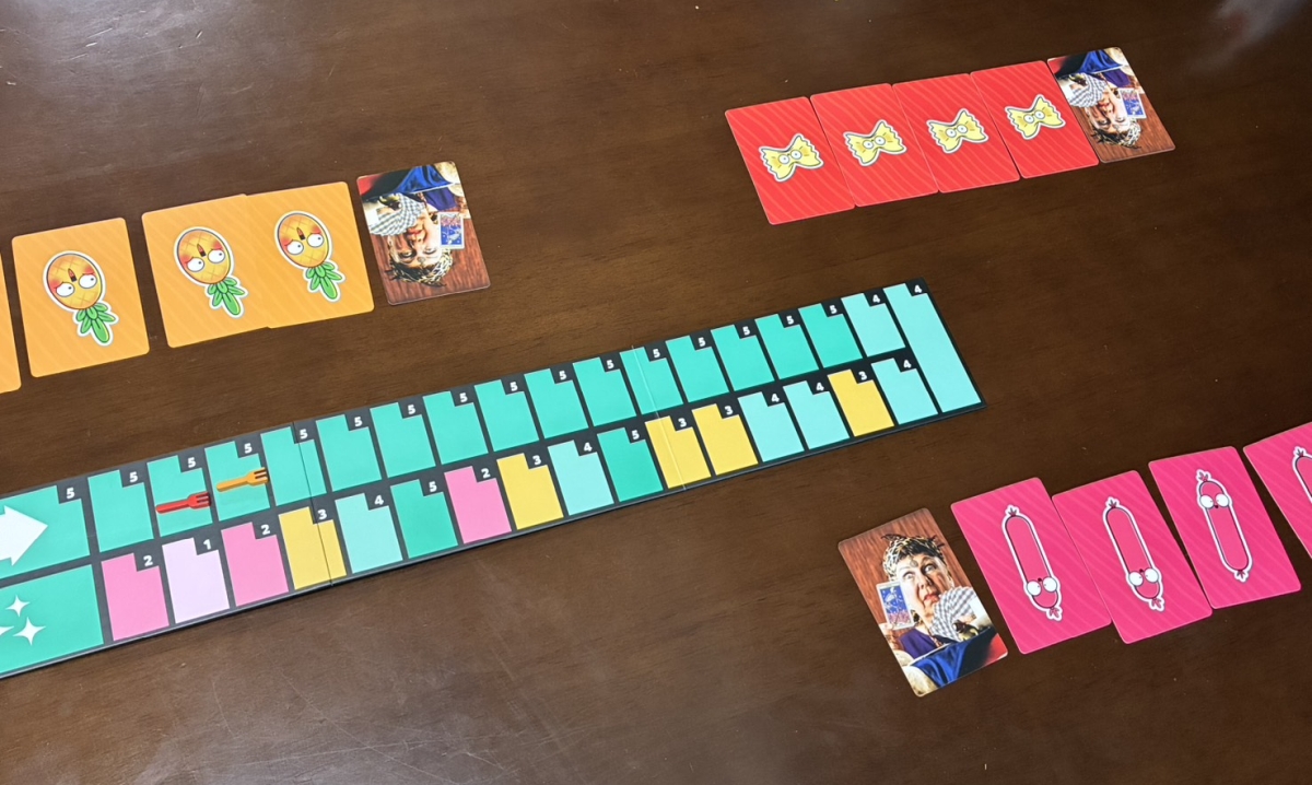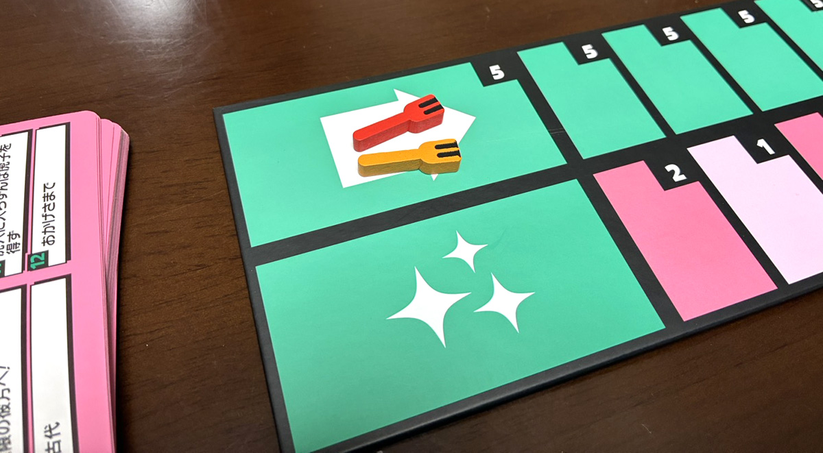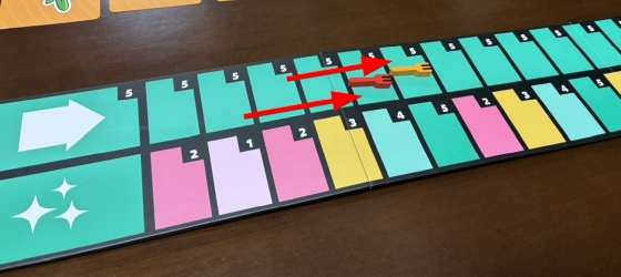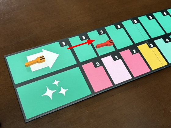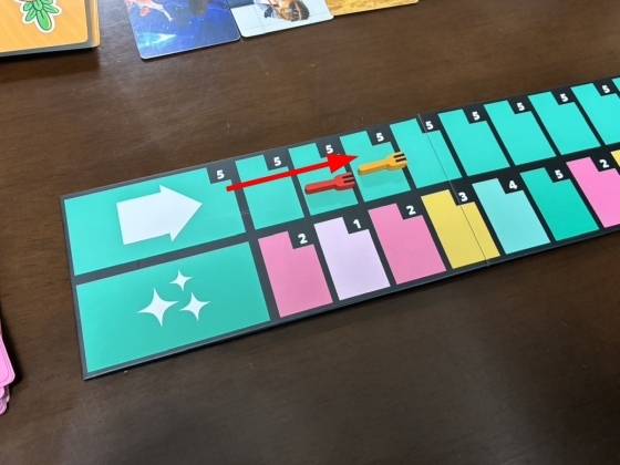 参照プレイヤーと選んだ写真カードが一致した場合、一致したプレイヤーのフォークトークンを「同じ順番で選んでいれば3マス」「選んだ順番が異なる場合は2マス」進めることができます。今回は5枚目と2枚目で順番が違ったため、赤プレイヤーのフォークトークンを「2マス」進めます。
