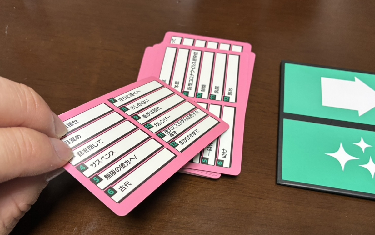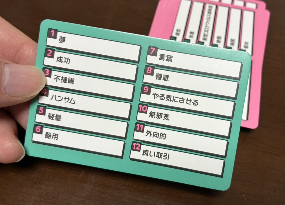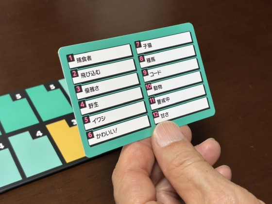 テーマカードには緑色の面とピンク色の面にそれぞれ1~12のテーマが書かれていますが、どちらの面を使用してプレイしてもOK。ルールブックには書かれていませんが、ピンクの面の方が難しいテーマが多い印象を受けました。なお、今回は緑色の面を使用しています。1ラウンド目に宣言された番号は「5」なので、テーマカードに書かれた5番のテーマを声に出して読み上げます。今回のテーマは「軽量」。