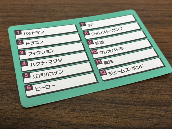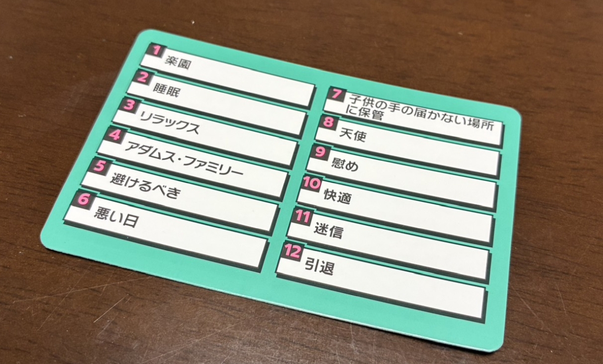 ゲームの進め方は非常にシンプル。まず、誰でもいいので1人のプレイヤーが1~12までの番号を1つ宣言し、テーマカードを1枚めくります。