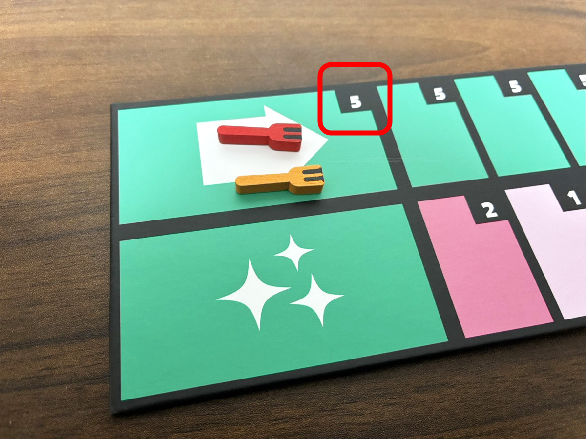 この場合、写真カードだけでなく順番まで「5枚目」で一致しているので、オレンジのプレイヤーはフォークトークンを3マス進めることができます。