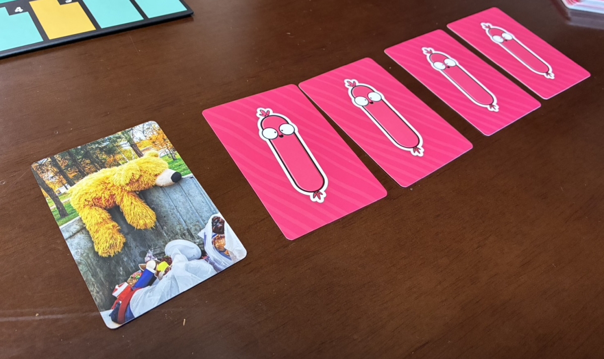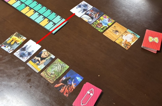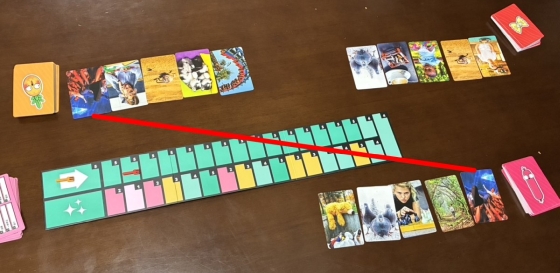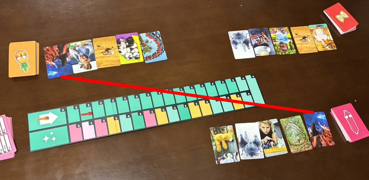 残念ながら最初の1枚では写真カードが一致しなかったためフォークトークンは進みません。同じようにして2枚目、3枚目、4枚目、5枚目……と順番に表向きに公開していきます。しかし、参照プレイヤーの感性が独特なのか、4枚目までは一度たりとも一致しませんでした。そして、5枚目にしてようやく「赤のプレイヤーが5枚目に選んでいた写真カード」と「参照プレイヤーが2枚目に選んでいた写真カード」が一致。