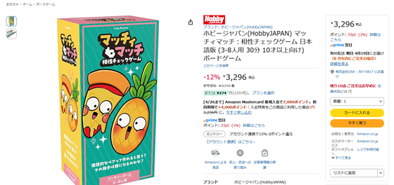 「マッチィマッチ:相性チェックゲーム」の希望小売価格は税込3740円。Amazon.co.jpだと、記事作成時点で税込3296円で購入可能でした。