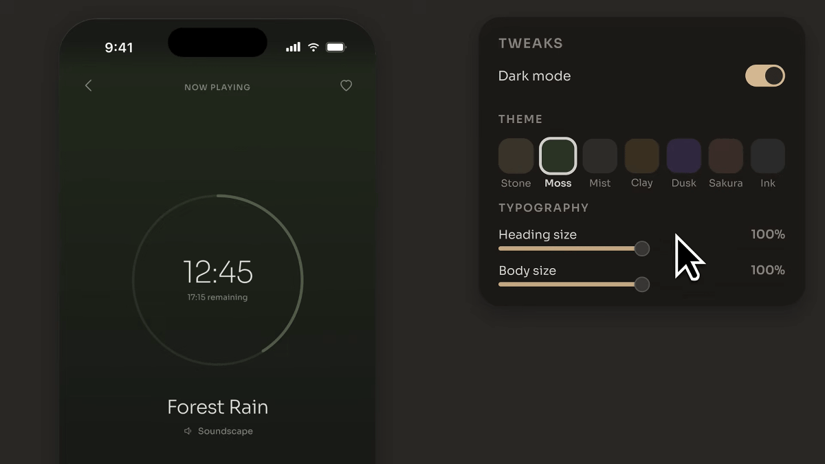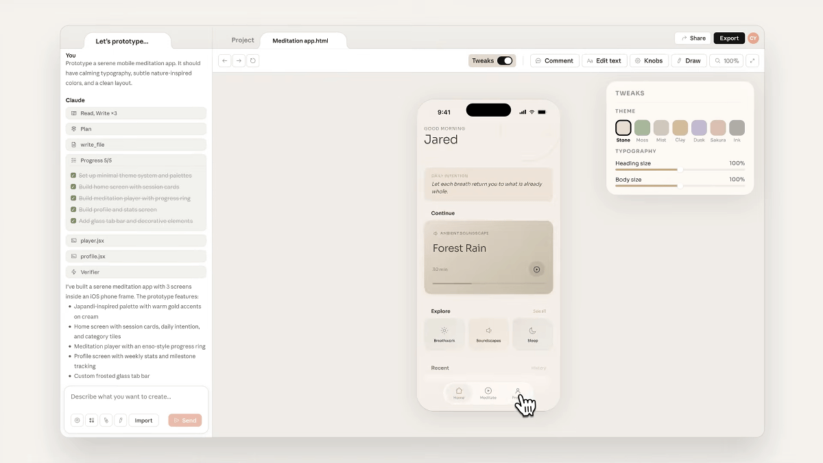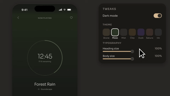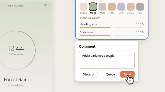 Claude Designはデザインの下書きと同時に配色などを変更するメニューも生成してくれます。また、足りないメニューの追加も指示することも可能です。例えば「ダークモードのトグルスイッチを追加して」と指示します。