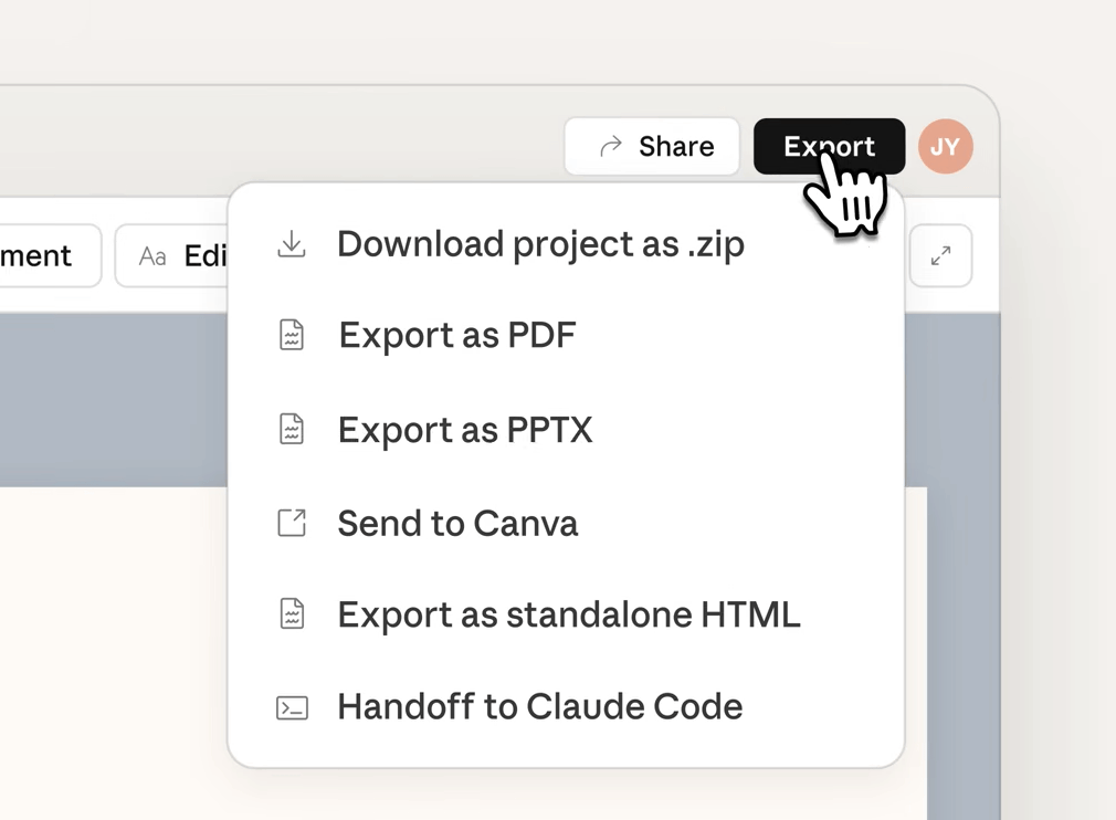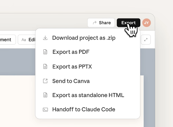 作成したデザインはPDFファイルやPPTXファイル、HTMLファイルとして出力可能。さらに、CanvaやClaude Codeに引き渡すこともできます。