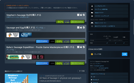 SteamにおけるStephen’s Sausage Rollの定価は3400円ですが、2026年4月29日までは80%オフの680円で販売されています。