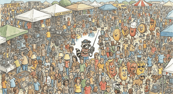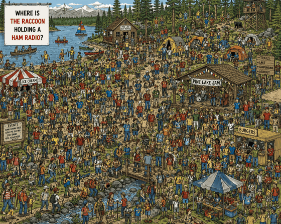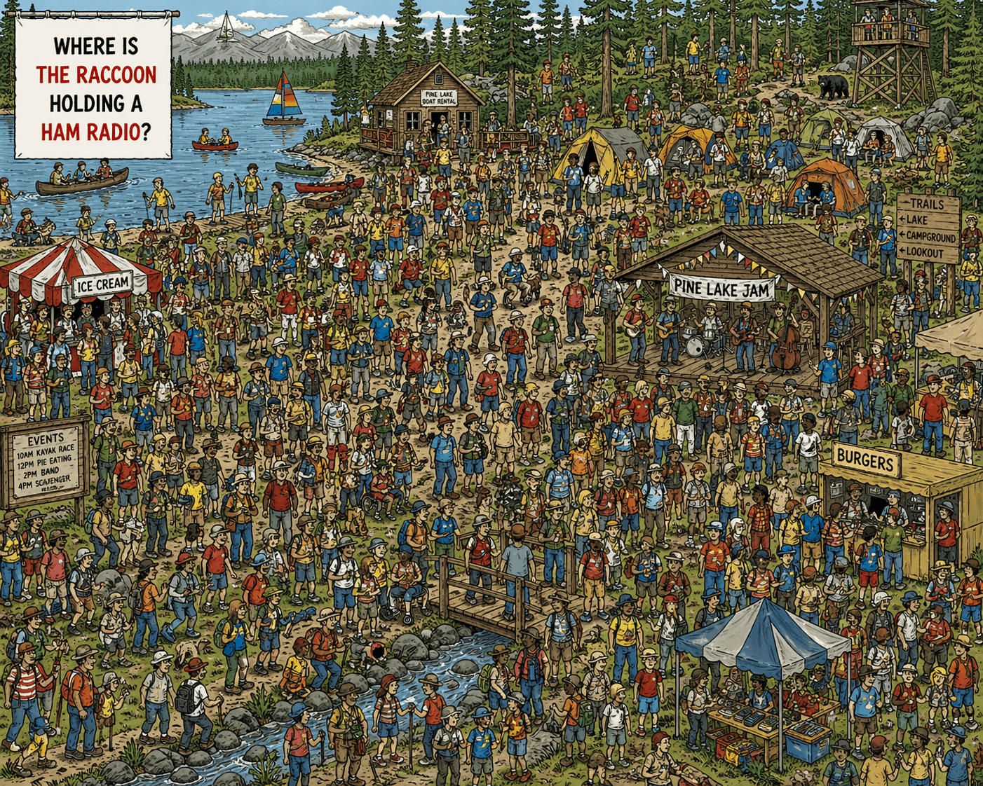 今回ウィリソン氏は、「Do a where’s Waldo style image but it’s where is the raccoon holding a ham radio(『ウォーリーをさがせ!』風の画像を作ってくれ。ただし、今回はアマチュア無線機を持ったアライグマを探すことにして)」というプロンプトを用いて、さまざまな画像生成AIに画像を生成させました。