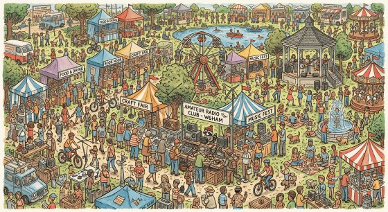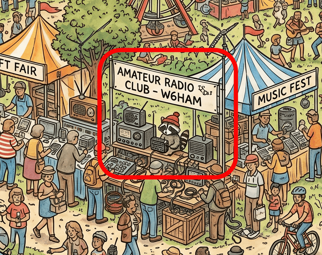 Nano Banana 2が生成した画像の中央には、以下の赤枠で示した「アマチュア無線クラブ」のブースにアライグマが描かれていました。確かに「アマチュア無線機を持ったアライグマ」はいるものの、『ウォーリーをさがせ!』のように群衆の中に隠れているわけではありません。