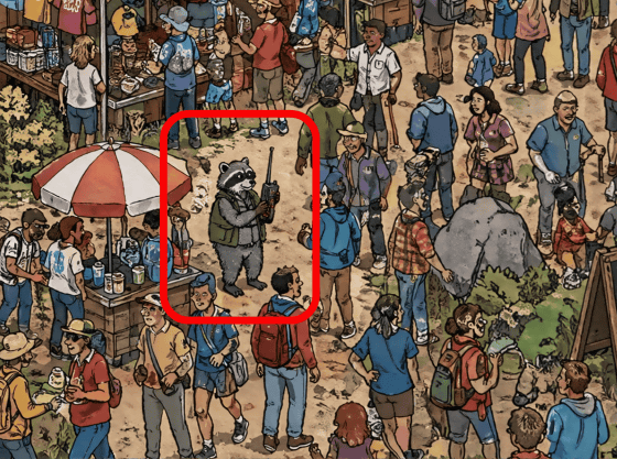 ウィリソン氏は上の画像をしっかり調べても、「アマチュア無線機を持ったアライグマ」を見つけることができませんでした。そこで、高解像度画像に対応したClaude Opus 4.7に「アマチュア無線機を持ったアライグマ」を探すように指示してみたものの、AIにも見つけることはできなかったとのこと。
