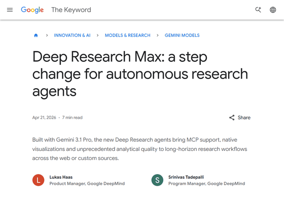 GoogleがGemini 3.1 Proをベースに構築された新しいAIエージェントの「Deep Research Max」を発表しました。
