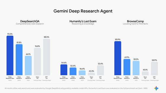 なお、Deep Research MaxはGoogleが開発したAI向けの検索・質問応答タスクのベンチマークであるDeepSearchQAで93.3%、人類トップレベルの知識・推論にAIがどこまで迫っているかを測るベンチマークのHumanity’s Last Exam(HLE)で54.6%、AIの検索力を測るベンチマークであるBrowseCompでは85.9%という高いスコアを記録しています。