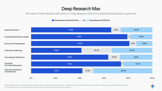 以下のグラフはDeep Research Maxと2025年12月にリリースされた初期バージョンのDeep Researchの性能を比較したものです。「Expert Eval Score(人間の専門家がAIの回答を評価したスコア)」「Comprehensiveness&Depth(網羅性&深さ)」「Strructure&Presentation(構成&読みやすさ)」「Instruction Following(指示にどれだけ従っているか)」「Grounding&Attribution(根拠の明確さ&出典の信頼性)」「Synthesis&Conflict Resolution(情報の統合&矛盾の処理)」「Internal Consistency&Faithfulness(内部整合性&忠実性)」といった評価項目において、内部整合性&忠実性以外では明確にDeep Research Maxが初期のDeep Researchを上回っています。
