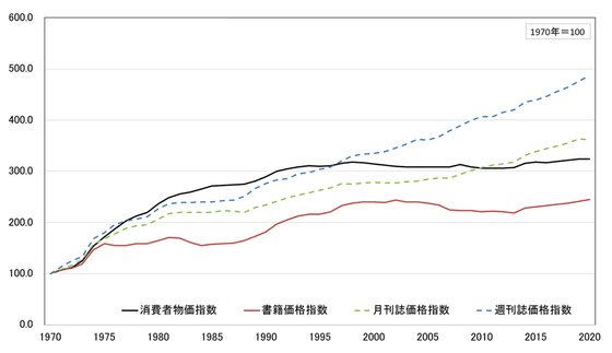 日本では全国出版協会の出版科学研究所が消費者物価指数と出版物の価格指数を比較した図を公開しています。月刊誌や週刊誌は付録が一般化したことにより1990年代後半から消費者物価指数を上回る勢いで価格が上昇していますが、一般書籍の価格指数は消費者物価指数を下回っており、日本でも「書籍はインフレに強い」と言ってよさそうです。