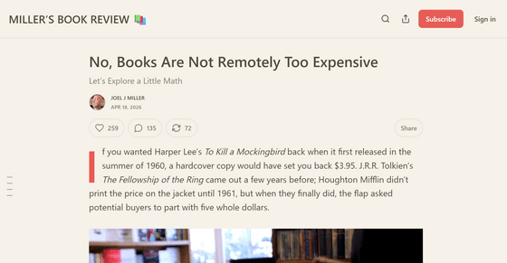 ミラー氏は「出版社にこれ以上値下げを行える余地はない」と述べ、「人類が生み出した最も没入感のあるエンターテインメントを10時間から20時間も提供してくれる」と本の利点を強調。「本の価格は上昇したが、他の物価ほどは上昇していない。人々が安さに慣れすぎたせいでそれがお得だったことを忘れてしまっただけだ」と本が安いことを再び訴えました。