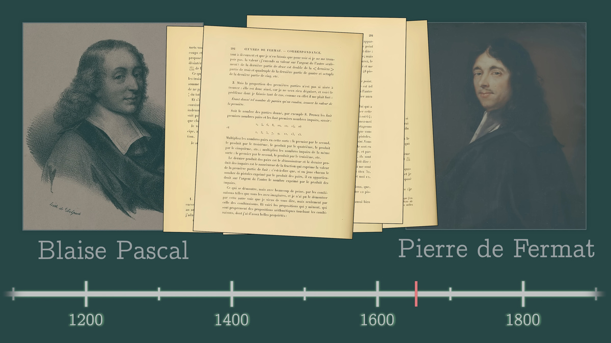 そこで、議論は「すでに何点取ったかではなく、これから先に誰が勝つ可能性が高いかを見るべきだ」という方向に進みます。この議論を進めたのが、17世紀の数学者であるパスカルとフェルマーです。2人は手紙をやりとりしながら、「これから起こり得る展開を平均して考える」というアイデアに到達します。
