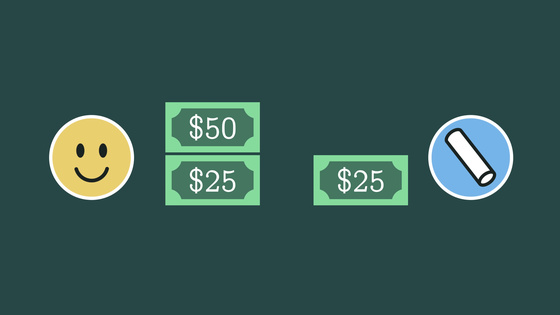 一方、パスカルは同じ結論を、もっと直感的なやり方で出します。次の1回で勝てば100ドル全部が相手のものになり、次を落として同点になればその時点では50ドルずつになります。そうすると、少なくとも50ドルは相手の取り分として確実で、残りの50ドルはどちらが取るか半々なので25ドルずつに分け、結局75ドル対25ドルになります。