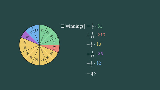 期待値は、各結果について「その結果が起こる確率×その結果の価値」を計算し、それを全部足し合わせたものです。たとえば、賞金が当たるルーレットを回す場合、期待値は「平均すると何ドル勝つことになるか」を表します。