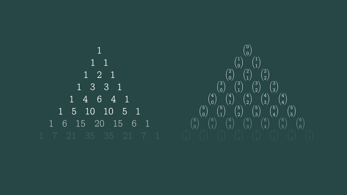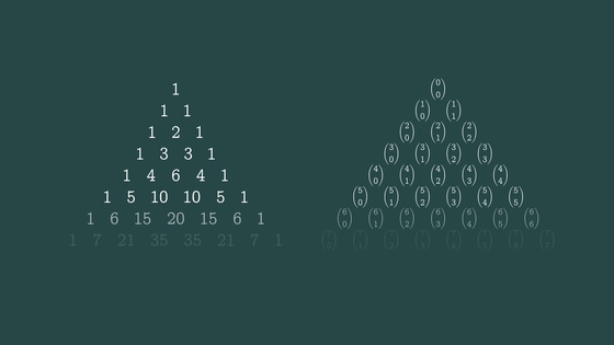 「12回のうちちょうど5回勝つ並び方は何通りか」「6回勝つ並び方は何通りか」を数えるために、「12C5」「12C6」などの二項係数が出てきます。こうした数を並べたものがパスカルの三角形で、各行がコイントス結果の分布を表せるようになります。