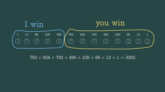12回のコイントスには2の12乗、つまり4096通りの可能性があります。これを全部書き出すのは大変なので、「12回のうち何回勝つか」というまとまりで数える方法に進みます。